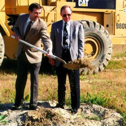 No, he's not burying a cat. Jack Williams of Pacific Research & Engineering is breaking ground on the company's new 100,000 square foot building on South Melrose in Vista. Lusardi CEO John Bailey is looking on. What's wrong with this picture? (Hint: Who's paying the bill here, anyway?) The building should be ready to move into by December. They've been on Las Palmas Boulevard in Carlsbad since 1983.